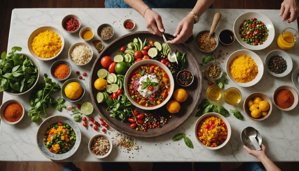 Dotez-vous d’une assiette blanche ou noire pour faire ressortir les couleurs. Jouez avec les hauteurs en empilant ingénieusement vos ingrédients – empilez vos légumes en tour ou vos viandes en tranches. Une astuce : utilisez des fleurs comestibles comme la capucine ou la bourrache non seulement pour décorer mais pour donner une touche subtile de saveur.